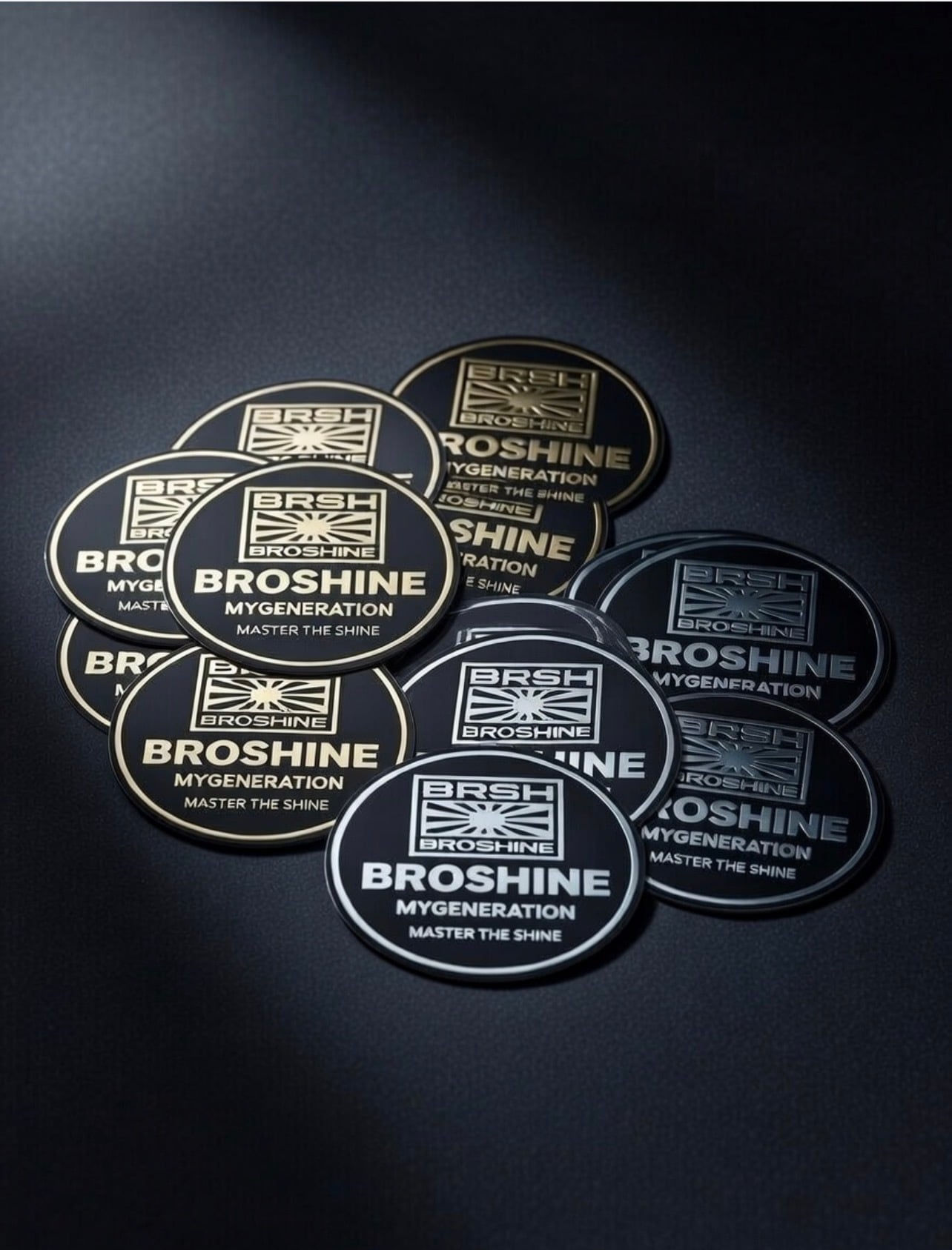 直径約5cmの円形。漆黒のブラックベースに、金(ゴールド)と銀(シルバー)のメタリックが光を反射し、洗車後のボディのように艶やかに輝く。